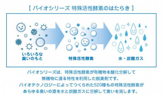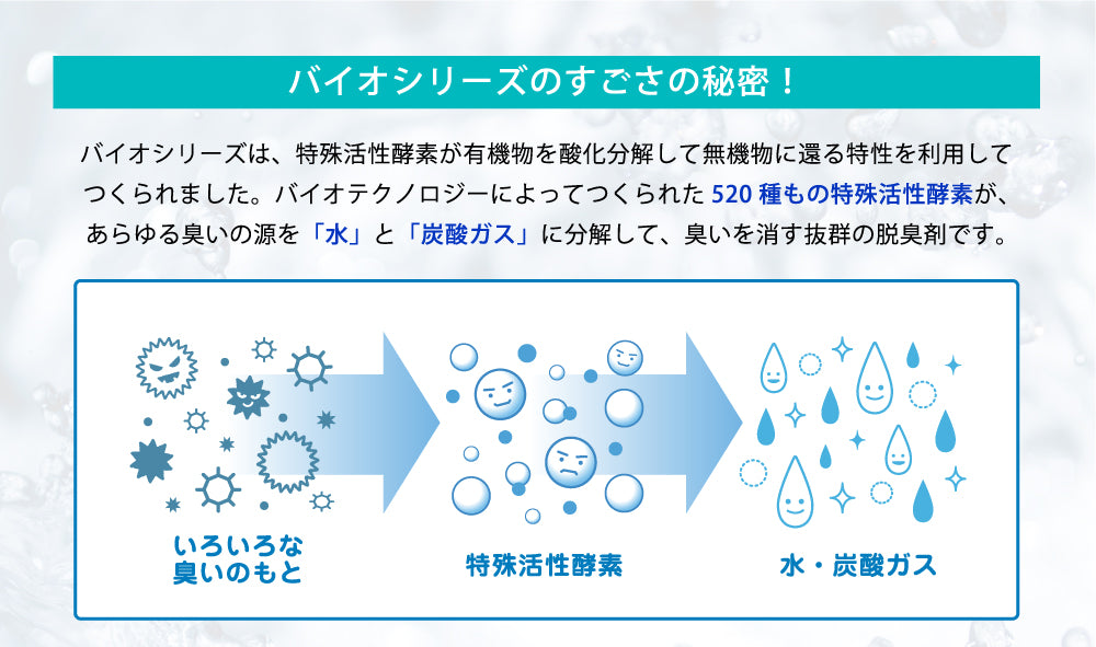 バイオテクノロジーによってつくられた520種もの特殊活性酵素が、あらゆる臭いの源を水と炭酸ガスに分解して、臭いを消す抜群の脱臭剤です。