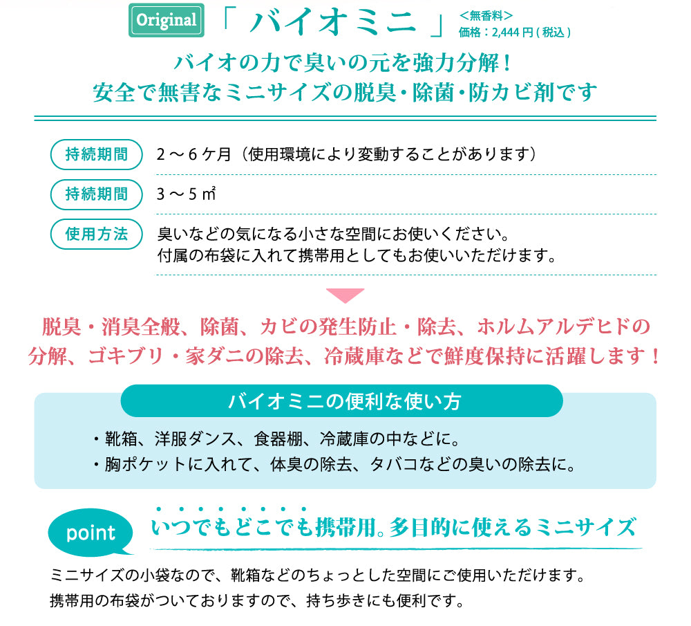 【特殊活性酵素から作られたバイオシリーズ携帯用。強力脱臭、除菌、防カビに有効です。】